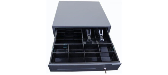cash drawer, front opening, dimensions (WxHxD): 410x114x415mm, insert: 6 note compartments, 8 coin compartments, 1 receipt compartment, direct printer connection, RJ12, colour: stainless steel.