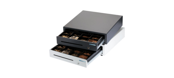 cash drawer, front opening, dimensions (WxHxD): 410x114x415mm, insert: 6 note compartments, 8 coin compartments, 1 receipt compartment, direct printer connection, RJ12, colour: white (glossy).