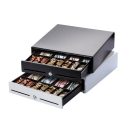 cash drawer, front opening, dimensions (WxHxD): 330x101x330mm, insert: 4 note compartments (horizontal), 8 coin compartments, 1 receipt compartment, 3-pos. lock, direct printer connection, RJ12, colour: white.