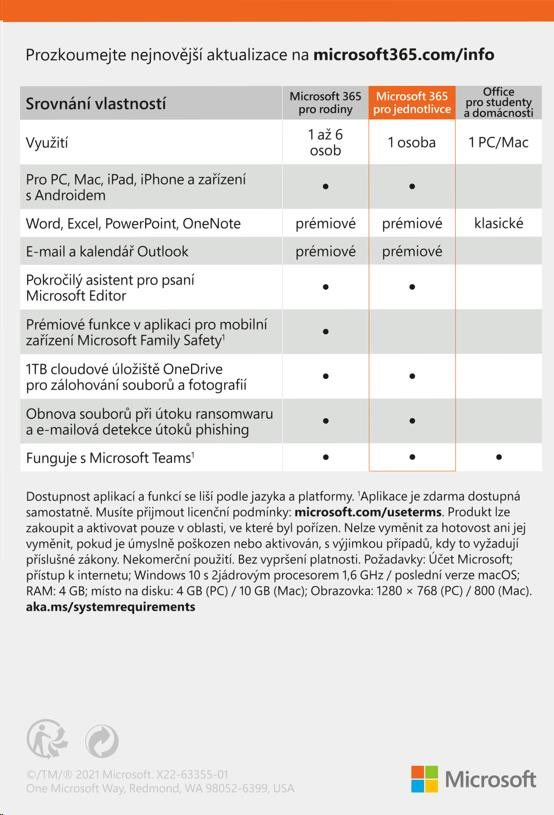 Předplatné Microsoft 365 (dříve známé jako Office 365) umožňuje ovládání nejen klasicky klávesnicí a myší, ale i prostřednictvím dotyku a stylusů, abyste byli na každém zařízení maximálně efektivní. Tato licence pro jednotlivce Microsoft 365 zahrnuje aplikace Word, Excel, PowerPoint, OneNote a další pro 1 osobu na rok (možnost nainstalovat až na 5 zařízení, ovšem vždy jedné osoby). K předplatnému dostanete také 1TB online úložiště OneDrive, abyste měli vaše důležité dokumenty zálohované a k dispozici, kdykoli a kdekoli potřebujete – na každém zařízení!