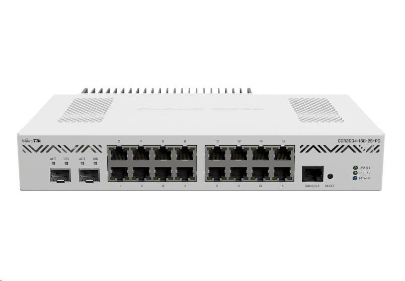 CCR2004-16G-2S+PC je desktopový nebo rackmount router do 19" racku z nové řady CCR routerů, která přichází s pasivním chlazením a nejvyšším poměrovým výkonem na 1 jádro ze všech CCR, což je nejdůležitější aspekt, pokud jde o náročnější operace založené na processing per-connection (např. QoS). Router je poháněn CPU s 64bit ARM architekturou s taktem 1200 MHz, má 4GB RAM typu DDR4 a 128MB NAND uložiště.