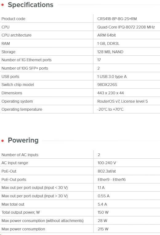 PoE CRS switch s 16x Gbps LAN (8 z nich s POE-out) , 2x 10Gbps SFP+, 1x USB 3.0 a dvěma RJ45 porty (management a konzole) v rack provedení. CRS418-8P-8G-2S+RM je dostatečně výkonný na to, aby nahradil většinu routerů pro malé a střední kanceláře. Vhodný především pro hybridní sítě na 2/3 vrstvě - ať už segmentujete síť pomocí VLAN, nebo mezi nimi routujete. Díky čtyřjádrovému procesoru ARM s frekvencí 2,2 GHz, HW offloading L3 a systému RouterOS v7 jej můžete používat jako internetovou bránu, firewall, a dokonce i jako řadič CAPsMAN. Využít můžete 8 PoE-out portů (802.3af/at a 24V pasivní PoE-out) pro napájení zařízení přímo ze switche s až 150 W celkového výkonu, inteligentním řízením PoE a omezením proudu na port. Praktické řešení pro instalace vyžadující nepřetržitý provoz s enormními objemy dat Technické specifikace: Product code: CRS418-8P-8G-2S+RM CPU: Quad-Core IPQ-8072 2208 MHz Size of RAM: 1 GB, DDR3L Storage: 128 MB, NAND Number of 1 GbE Ethernet ports: 17 10G SFP+ ports: 2 USB ports: 1 USB 3.0 type A Operating system: RouterOS v7 (License level 5) Supported input voltage: 2x AC power supply 100 - 240 V Dimensions: 443 x 230 x 44 mm Operating temperature: -20°C to +70°C Napájecí specifikace: PoE-out: 802.3af/at PoE-out ports: Ether9 - Ether16 Max out per port output (input < 30 V) : 1.1 A Max out per port output (input > 30 V): 0.55 A Max total out : 5.4 A Total output power, W: 150 W Max power consumption: 215 W Max power consumption without attachments: 28 W Upozornění: Výrobce MIKROTIK nevztahuje záruku na zařízení poškozená přepětím. Zařízení je třeba na vstupech adekvátně chránit proti indukovanému elektrostatickému přepětí či přepěťovým špičkám na silovém vedení. Při venkovních instalacích je třeba používat stíněnou kabeláž (FTP/SFTP), příslušné přepěťové ochrany (pokud nejsou integrovány) a provést korektní a efektivní uzemnění. Zařízení vždy provozujte s poslední výrobcem publikovanou verzí (výrobcem označenou "Stable") operačního systému RouterOS. Taková verze garantuje nejoptimálnější funčknost, obsahuje opravené chyby z verzí předchozích a výkonová vylepšení. . MikroTik, MikroTikls SIA Latgales iela 22 Rīga, LV-1050 Lotyšsko, info@mikrotik.com