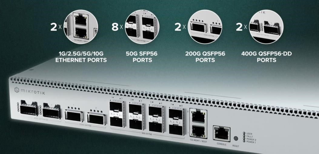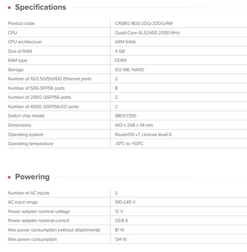 400 Gigabitové připojení bez cenového šoku! CRS812 DDQ je další krok vpřed – výkonný, efektivní a cenově dostupný způsob, jak dostat 50G, 200G a 400G do vašeho racku. RouterOS v7 Hot-swap ventilátory Dvojité redundantní hot-swap napájecí zdroje Čtyřjádrový ARM CPU 2 GHz 4 GB RAM Kde najde uplatnění? Top-of-rack / leaf switch s 400G uplinky do spine vrstvy Campus core propojující starší 10G s moderními 50G rozhraními Agregační uzel pro poskytovatele služeb Laboratoře, AI clustery, mediální workflow s vysokými nároky na „east-west“ provoz 400G dříve znamenalo drahé, složité a nedostupné řešení. CRS812 DDQ to mění! Moderní Marvell switch čip a výkonný ARM CPU přináší pokročilé routovací, switchovací a traffic management funkce důvěrně známé z milionů nasazení RouterOS – nyní až do 400 Gbps! CRS812 posune vaši síť z 10 až na 400G v jednom jednoduchém a cenově dostupném RouterOS v7 boxu – bez nutnosti velkých investic. 400 Gigabitů je nyní dostupných – budoucnost sítě bez kompromisů a se zachováním kompatibility s existující infrastrukturou! Podporované rychlosti rozhraní CRS812 2× 1G/2.5G/5G/10G Ethernet porty 8× 1G/2.5G/5G/10G/25G/50G SFP56 porty 2× 40G/50G/100G/200G QSFP56 porty 2× 40G/50G/100G/200G/400G QSFP-DD porty * QSFP56 / QSFP-DD porty podporují také break-out režimy až na 1G/2.5G/5G/10G/25G/50G Technické specifikace Kód produktu: CRS812-8DS-2DQ-2DDQ-RM CPU: Quad-Core AL52400 2000 MHz Architektura CPU: ARM 64bit RAM: 4 GB DDR4 Úložiště: 512 MB NAND Ethernet porty: 2× 1G/2.5G/5G/10G SFP56 porty: 8× 50G QSFP56 porty: 2× 200G QSFP-DD porty: 2× 400G Switch čip: 98DX7335 Rozměry: 443 × 268 × 44 mm OS: RouterOS v7, License L6 Provozní teplota: -10 °C až +50 °C Počet AC vstupů: 2 AC vstupní rozsah: 100–240 V Napětí adaptéru: 12 V Proud adaptéru: 20,8 A Max. spotřeba (bez příslušenství): 81 W Max. spotřeba: 134 W Dodávané příslušenství 2× napájecí kabel Rackmount uši Zadní rackmount uši Sada pro uchycení Související 400G příslušenství 400G DAC, 1 m – DDQ+DA0001 400G DAC, 3 m – DDQ+DA00031 400G optický transceiver, 100 m – DDQ+85MP01D Upozornění: Výrobce MIKROTIK nevztahuje záruku na zařízení poškozená přepětím. Zařízení je třeba na vstupech adekvátně chránit proti indukovanému elektrostatickému přepětí či přepěťovým špičkám na silovém vedení. Při venkovních instalacích je třeba používat stíněnou kabeláž (FTP/SFTP), příslušné přepěťové ochrany (pokud nejsou integrovány) a provést korektní a efektivní uzemnění. Zařízení vždy provozujte s poslední výrobcem publikovanou verzí (výrobcem označenou "Stable") operačního systému RouterOS. Taková verze garantuje nejoptimálnější funčknost, obsahuje opravené chyby z verzí předchozích a výkonová vylepšení. . MikroTik, MikroTikls SIA Latgales iela 22 Rīga, LV-1050 Lotyšsko, info@mikrotik.com