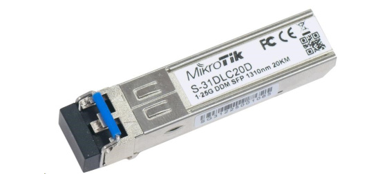 MikroTik S-31DLC20D je 1.25G SFP transceiver s 1310nm, dual-LC konektorem. Je určen pro jednovidová vlákna (SM - single mode). do 20km (s DDM).