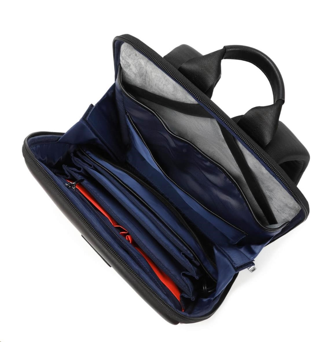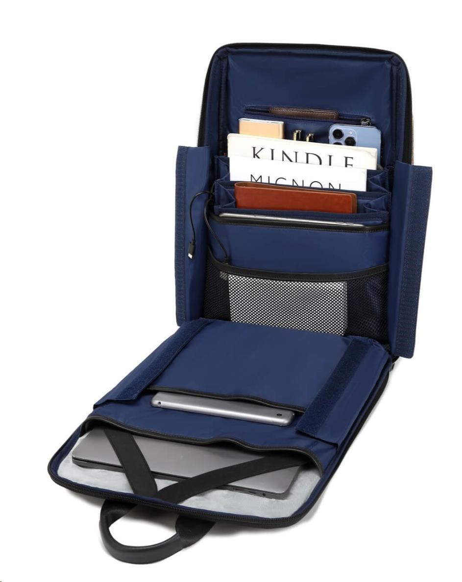 Součástí výbavy je vestavěný USB a USB-C port, díky kterým můžete snadno nabíjet svá zařízení na cestách (po připojení vlastní powerbanky). Praktická kapsa s otevíráním až do 180° umožňuje velmi přehledný přístup ke všem uloženým věcem.