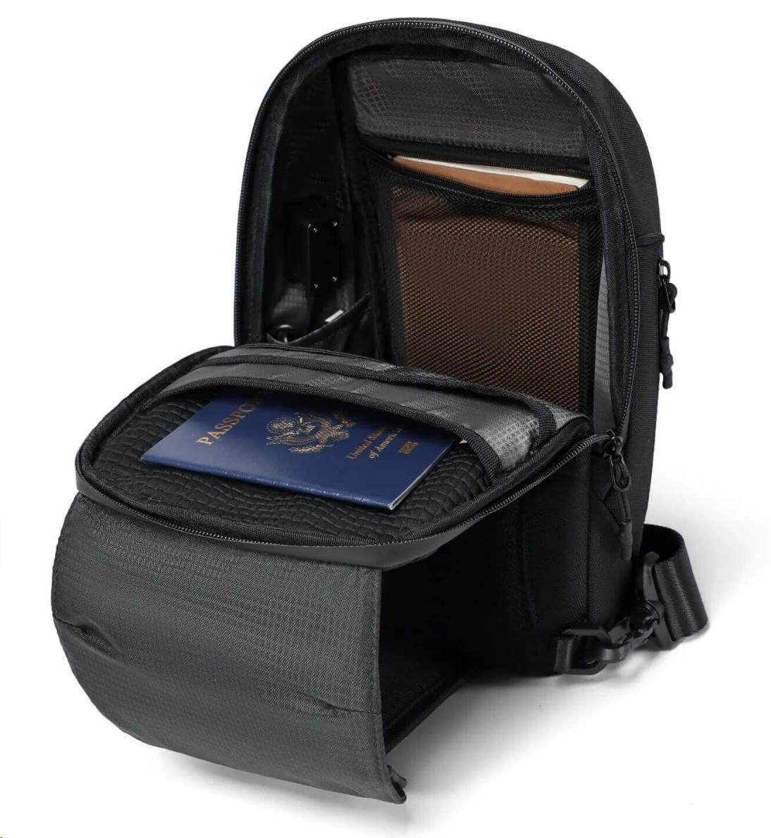V batohu najdete přehledně členěnou hlavní kapsu s vnitřními přihrádkami. Dále je k dispozici horní malá kapsa a skrytá bezpečnostní kapsa na cennosti.