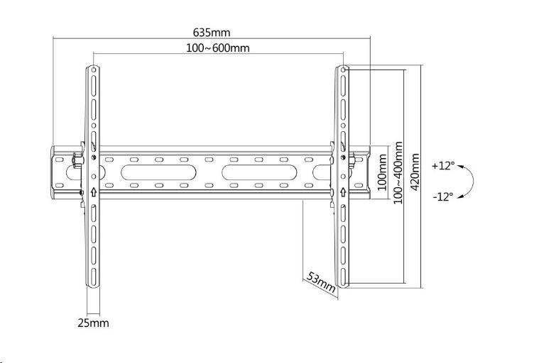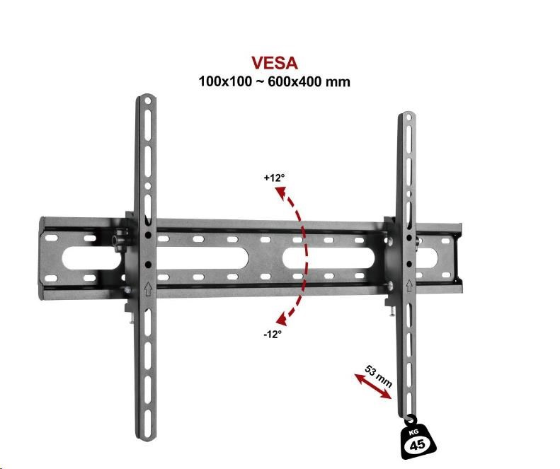 Držák na televize a displeje Fiber Novelty FN45T Držák na televize a displeje 37" - 75", naklápění +12° / -12°, vzdálenost od zdi 53mm, aretace proti vysazení, VESA standardy 100x100 až 600x400, nosnost 45kg Naklápěcí držák na televize a displeje Fiber Novelty FN45T Kvalitní nástěnný držák ideální pro bezpečné zavěšení televizorů nebo displejů s úhlopříčkou 37" až 75". Držák umožňuje snadné naklápění obrazovky pod úhlem od +12° až do -12°, potřebný úhel náklonu snadno zaaretujete. Vzdálenost obrazovky od zdi 53mm, zajištění proti vysazení, rozměr základové desky 635x100mm, materiál kov. Držák podporuje VESA standardy od 100x100 do 600x400mm, nosnost 45kg. Balení obsahuje instalační materiál. Záruka na držák 5 let. Technické údaje: nosnost 45 kg na televize, displeje a monitory s úhlopříčkou 37" - 75" podporuje VESA standardy 100x100 až 600x400 možnost naklápění +12° / -12° zajištění obrazovky v požadovaném náklonu vzdálenost od zdi 53mm aretace proti vysazení rozměr základové desky 635 x 100 mm balení obsahuje instalační materiál materiál kov barevné provedení černé záruka 5 let. Fiber Mounts s.r.o., Nádražní 1296/4 69601 Rohatec Česká republika, mailto: info@drzakyastolky.cz