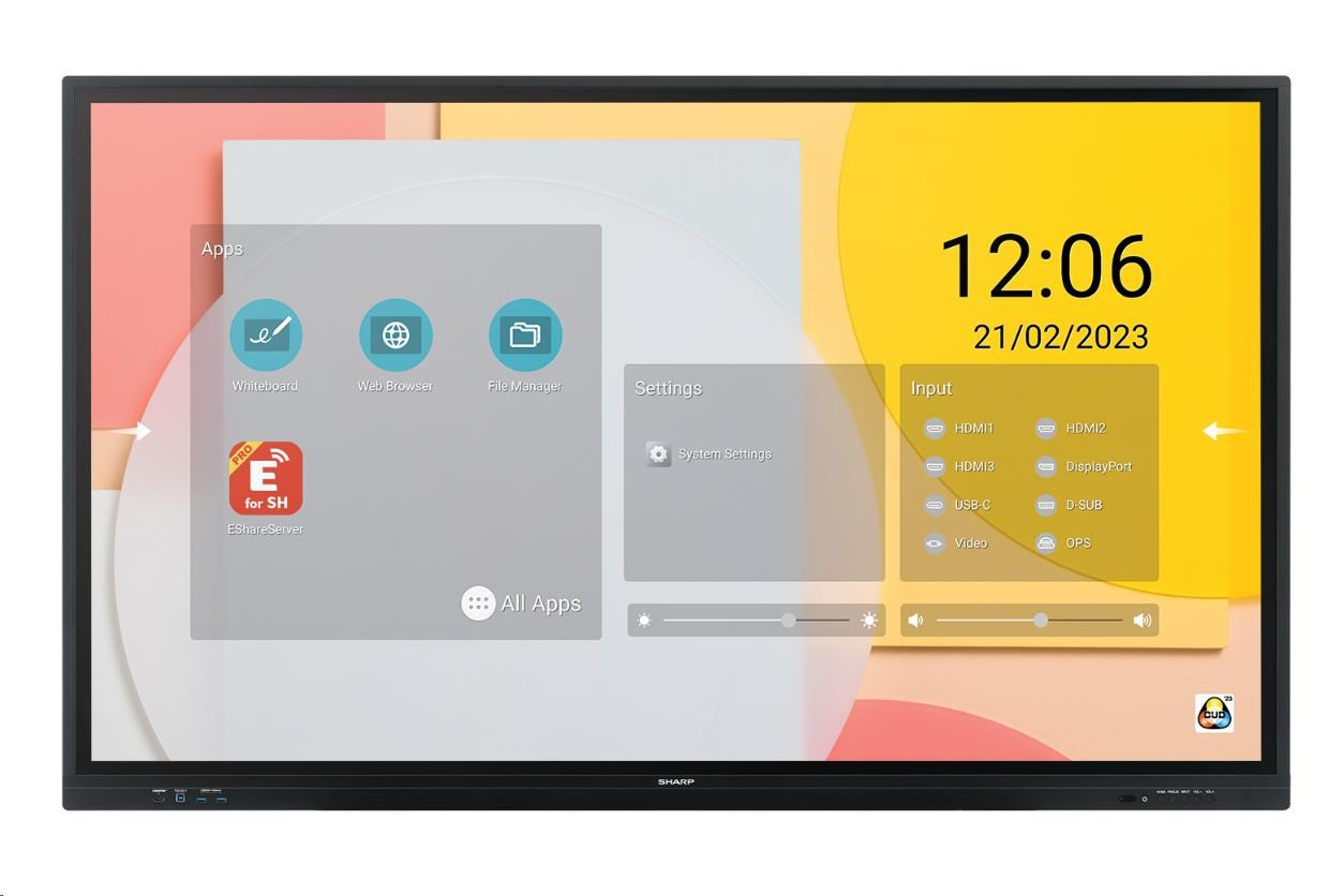 | Vestavěné aplikace | Správce souborů; Výběr vstupu; Nastavení; Webový prohlížeč; Tabule; Bezdrátové sdílení obrazovky - E-Share |