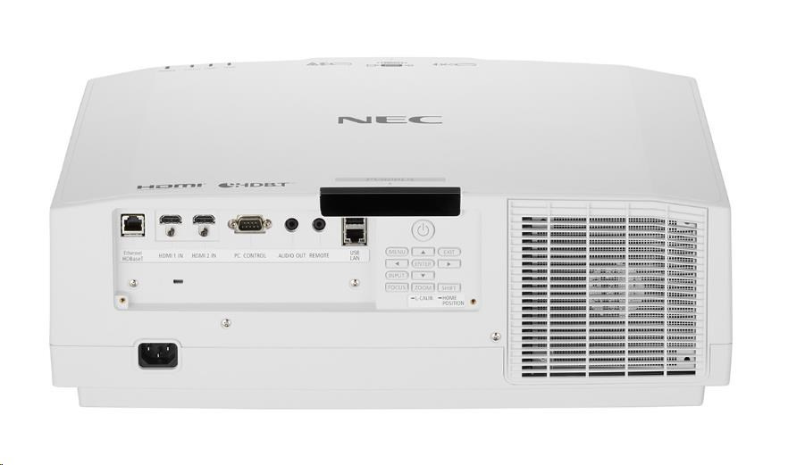 Speciální Charakteristika AMX Beacon; bez náklonu; Crestron RoomView; funkce Direct Power-Off; HDBaseT; Korekce trapezoidu (H=±40°, V=±40°); LAN control; manuální korekce podle barvy zdi; Nastavení světelného zdroje; NaViSet Administrator 2; ochrana heslem; OSD v 27 jazycích; Ovládání HTTP prohlížeče; ovládání přes RS-232; Paměť objektivu; PJ LINK; posun objektivu (vertikální +0.5 max/-0.1 max., horizontální ± 0.2 max.); režim Velká výška; simulace DICOM; Svislé nastavení; Testovací vzor; volitelné uživatelské logo; Životnost světelného zdroje 20 000 h
