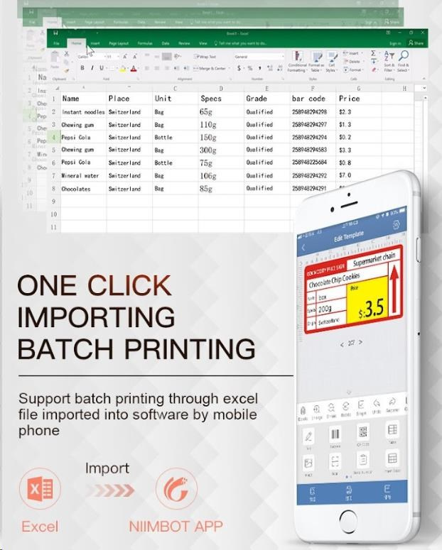 Model Niimbot B21S umožňuje také tisk přímo z PC. Do aplikace Niimbot si také můžete třeba naimportovat připravená data z Excelu.