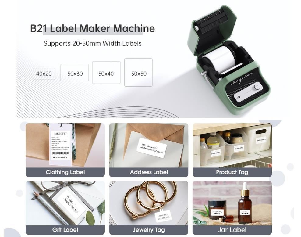 NIIMBOT B21S je tiskárna etiket, která kombinuje výkon, pohodlí a kvalitu. S její jednoduchou obsluhou a vynikajícími funkcemi vás překvapí, jak rychle a snadno můžete vytvářet profesionální etikety.