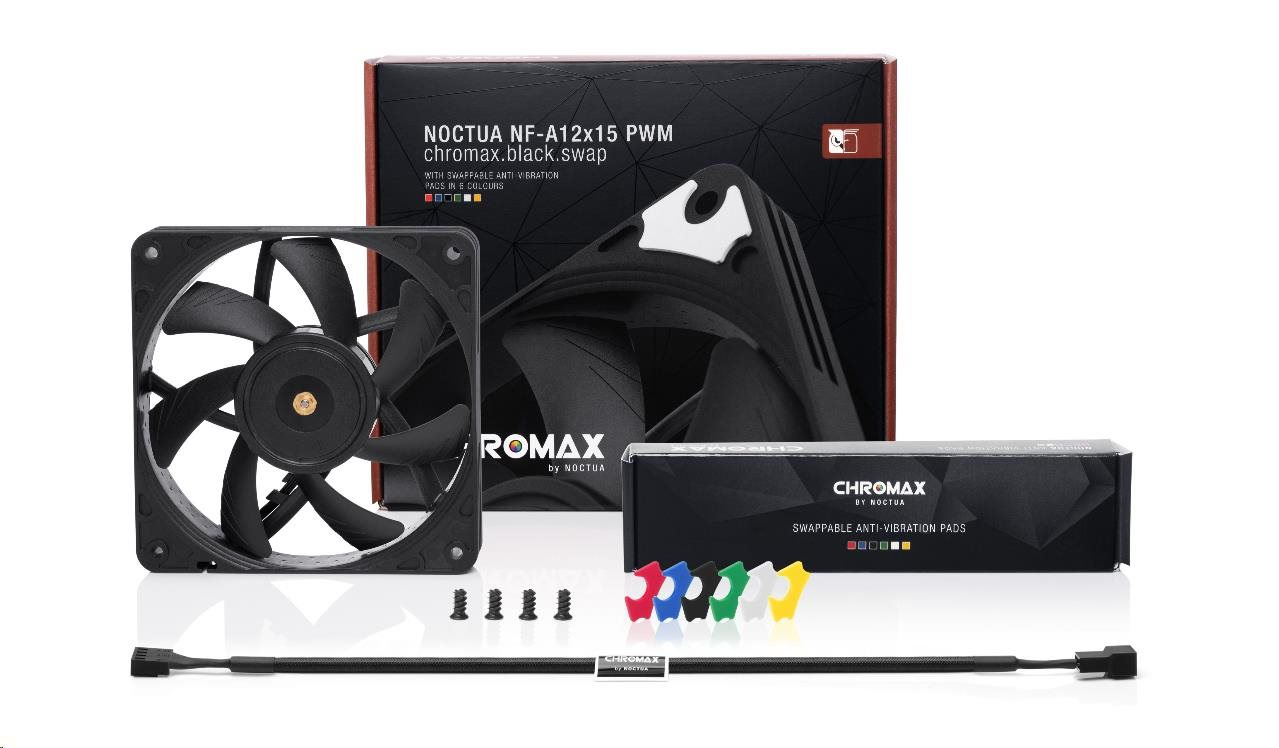 Řada NF-A12x15 se zasloužila o přední volbu při výběru 120mm větráčků množstvím ocenění a doporučení od technických časopisů a stránek po celém světě. NF-12x15 PWM chromax.black.swap kombinuje tichý chod této řady a elegantní celočerný design řady chromax.black. Balení obsahuje také sadu protivibračních podložek pro ty, kteří si rádi svůj stroj barevně sladí. Kvalitu chodu a spokojenost také zaručí SSO2 ložisko, více než 150000 hodin MTTF a 6 let záruky u výrobce.