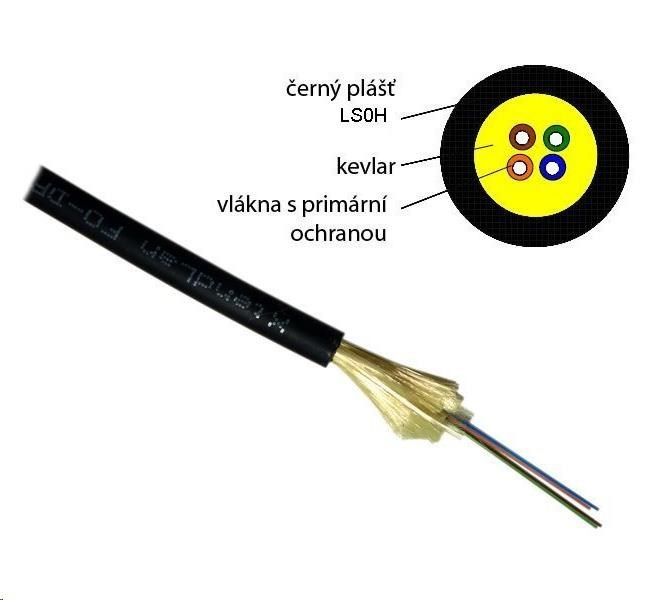 Ultraohebný optický kabel pro koncové rozvody, standard G.657A. Kulatý, průměr 3,6 mm. Singlemode 9/125 um, 4 vlákna, LS0H opláštění. Vlákna v primární ochraně 250 um, vedena středem a obalena kevlarem.