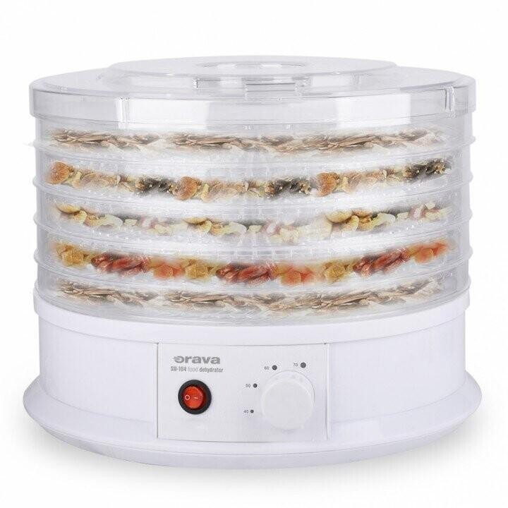 ORAVA SU-104 je praktická sušička potravin navržená pro každodenní domácí použití. Umožňuje šetrné sušení při zachování chuti, vůně i nutričních hodnot surovin. Díky rovnoměrné cirkulaci teplého vzduchu dochází k efektivnímu sušení bez nutnosti otáčení jednotlivých pater.