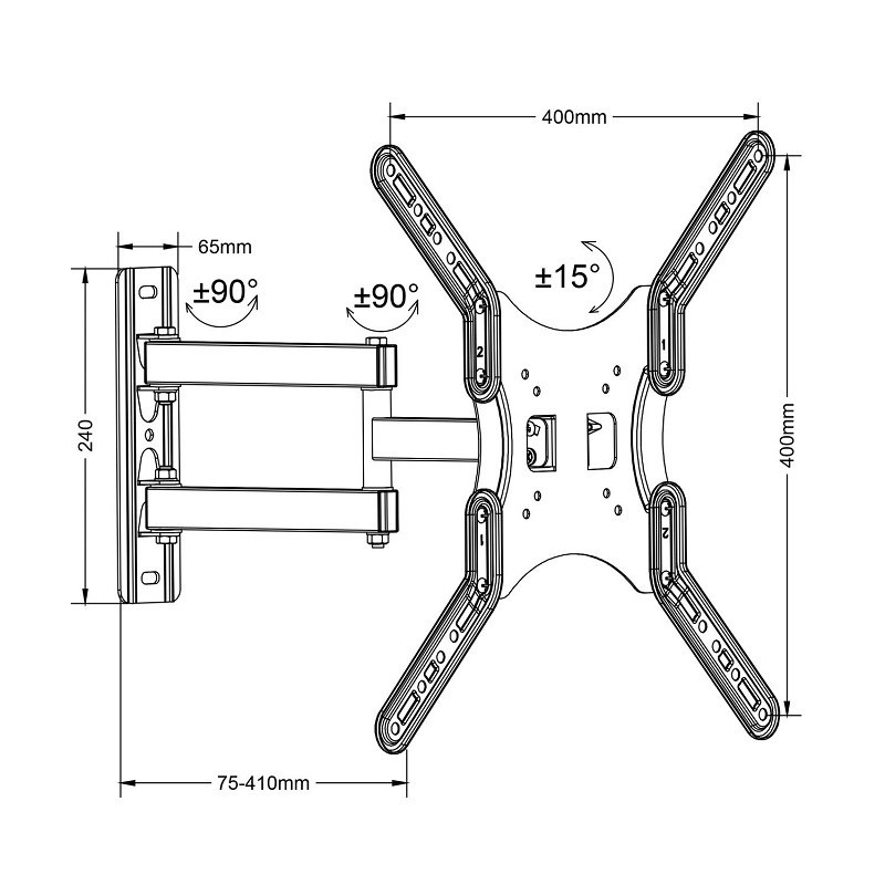Nástěnný držák na televizi nebo monitor 15-55", otočný +/-90°, sklopný +/-15°, vzdálenost Tv od zdi 75-410mm, VESA standardy 75x75 až 400x400, nosnost 30kg.Více