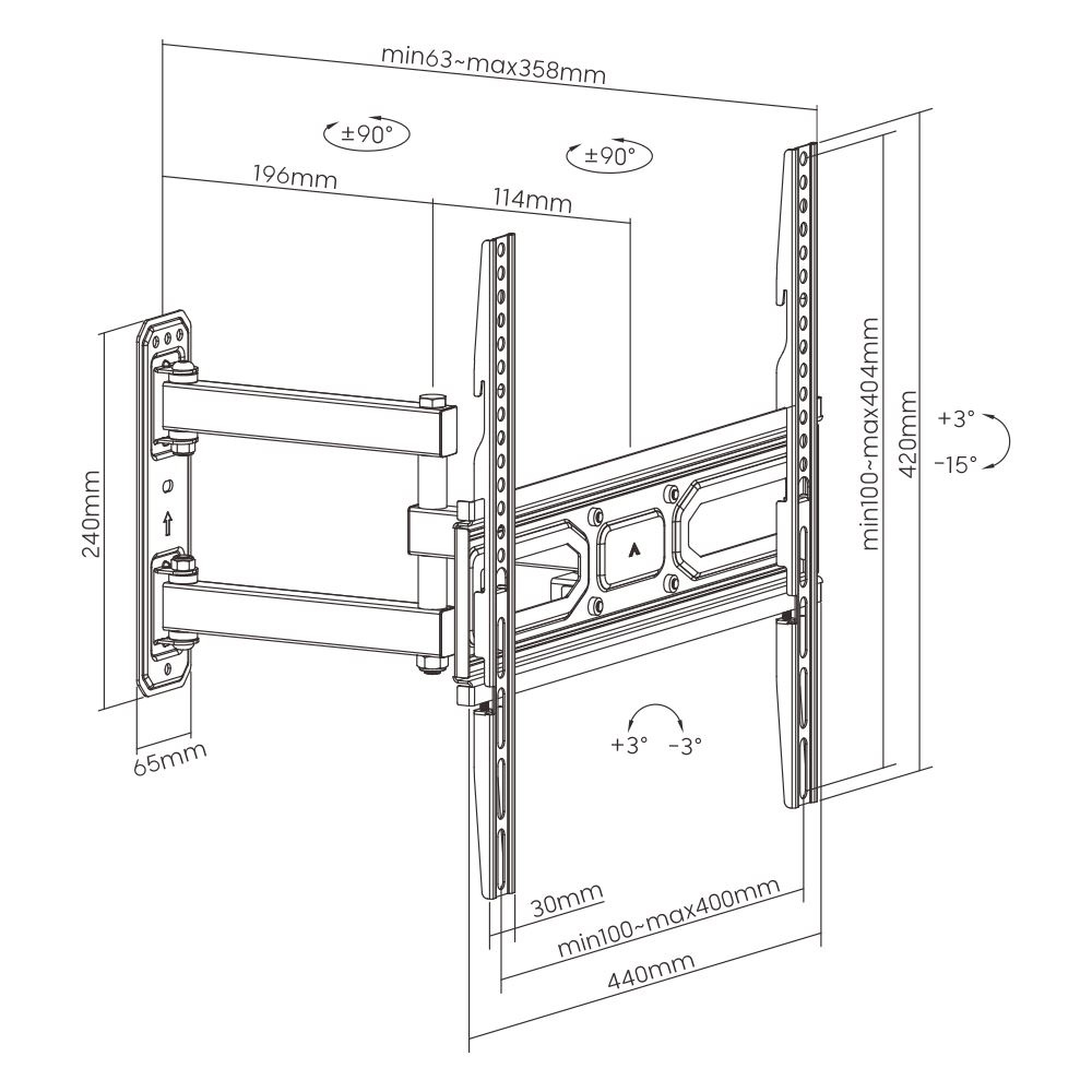 Kvalitní ocelový držák na televize 30-60", nastavení vzdálenosti Tv od zdi 63-358mm, otočný až +/-90°, sklopný +3°/-15°, korekce roviny +/-3°, instalační materiál, záruka 5 let, VESA 100x100 až 400x400, nosnost 35kg.Více