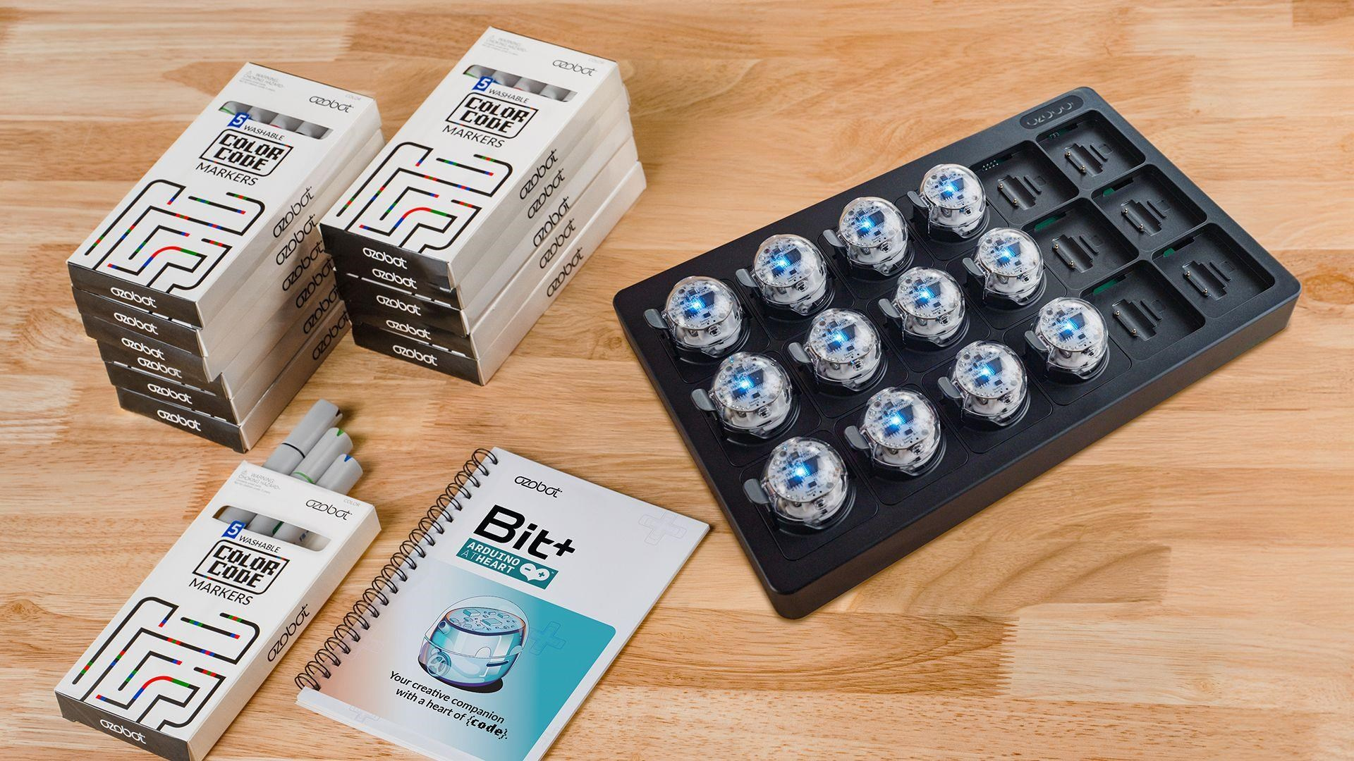 12 robotů Ozobot Bit+ 12 sad oboustranných barevných fixů Nabíjecí stanice s 12 sloty Samolepky a příslušenství k botům Návod k použití Dokumentace