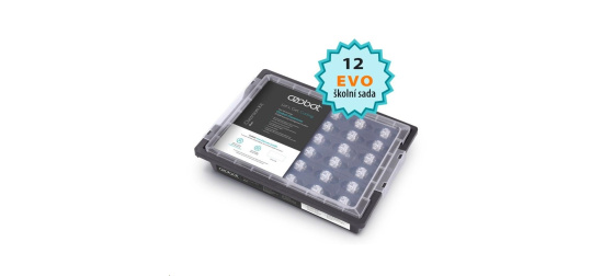 12 robotů Ozobot Evo 12 sad barevných fixů 1 soubor aktivit 1 nabíjecí stanice a napájecí kabel 2 balení samolepek Bot Label 1 balení samolepek značky Ozobot Rychlé návody a tipy v češtině