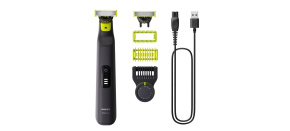 Zastřihovač vousů, použití na tvář i tělo, zastřihování, tvarování, holení, akumulátorový provoz, doba provozu 90 min, nabíjení 1 hodina, inovativní oboustranný břit OneBlade 360, zastřihování vousů ve 14 délkách, mokré a suché použití, LED indikátor baterie, voděodolný, ergonomická rukojeť, šetrné ošetření všech partií, ochranný nástavec pro citlivé oblasti, hřeben na tělo, náhradní břit OneBlade, kabel USB-A (adaptér není součástí balení).