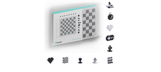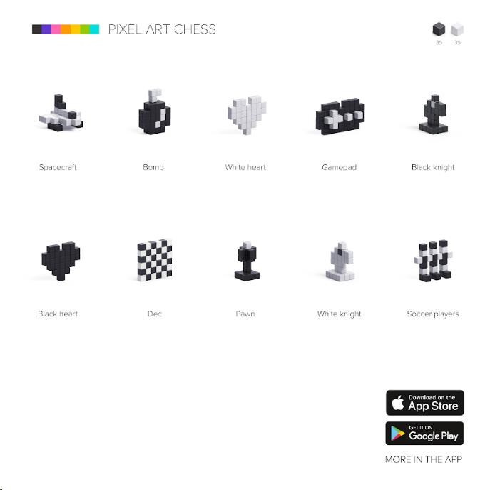 Stavebnice PIXIO 70101 Chess (Šachy) obsahuje hrací desku se šachovnicí pro šachy a další hry využívající dvoubarevné hrací pole 8x8 a dohromady 70 bloků v černé a bílé barvě, se kterými můžete postavit nejen šachové figurky a zahrát si partii, ale i mnoho dalších modelů. Umožní oživit vaše kreativní nápady a přinesou barevnou radost do života. Začněte tavbou jednoduchých modelů podle pokynů a poté, až budete připraveni, přejděte k vytváření vlastních návrhů. S touto sadou postavíte šachové figurky, raketoplán, gamepad, cílovou vlajku, bombu, bílé nebo černé srdce a mnoho dalších. Pixio je splněný sen pro fanoušky Pixel Art, hráče Minecraftu a všechny, kdo si prostě rádi hrají. Použijte jej jako učební zdroj pro rozvoj kreativity dětí. Obsahuje 35 černých a 35 bílých kostek a desku se šachovnicí. Využijte kostky dle své fantazie a tvořte krásné tvary a modely.