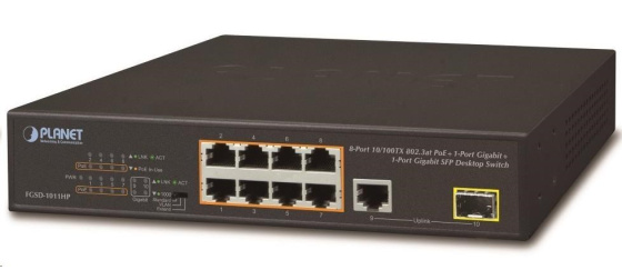 PoE přepínač s výkonem 120W, 8x 10/100Base-TX s možností napájení dalších IEEE 802.3at zařízení, dva uplink 1000Base-X porty 1x TP a 1x SFP.