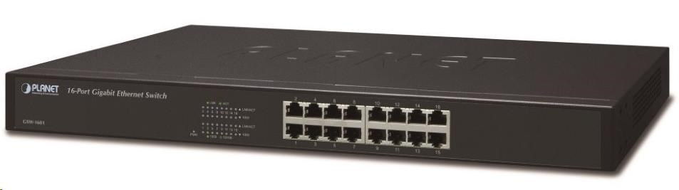 Switch GSW1601 je vybaven 16 porty 10/100/1000 Mb/s. Přepínací kapacita dosahuje hodnoty až 32 Gbps.