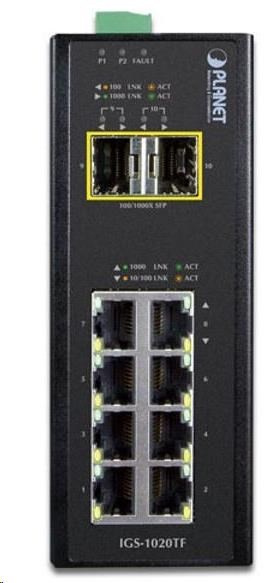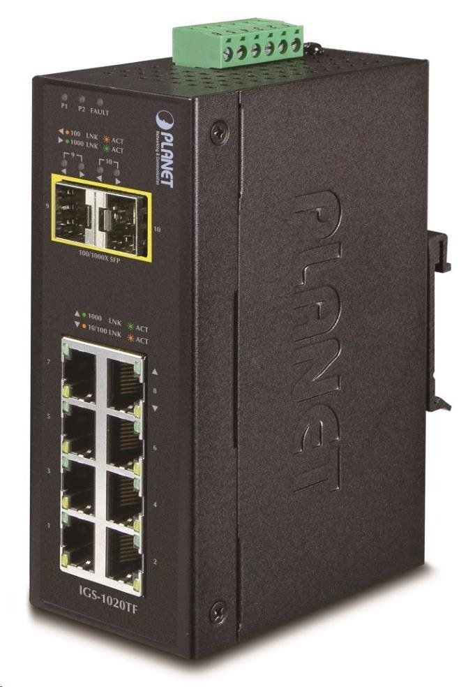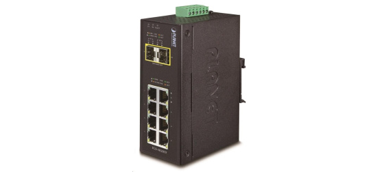 Průmyslový přepínač a konvertor 8x 10/100/1000Base-T, 2x SFP 100/1000Base-X. Energeticky efektivní dle 802.3az.