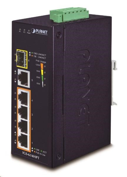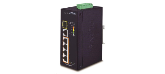 Popis Planet IGS-614HPT, PoE switch, 5x 1000Base-T, 1x SFP, 4x PoE 802.3at, -40~+75°C, 12-56VDC, dual-power, DIN