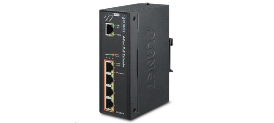 Popis Planet IPOE-E174 PoE extender + switch, IEEE802.3at, 4 + 1x 1000Base-T, DIN, IP30, 60W