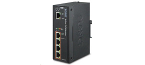 Průmyslový extender s gigabitovým přepínačem pro napájení po Ethernetovém kabelu, standard IEEE 802.3at. 1x vstupní napájecí PoE port (60W) + 4x injektory; celková zatížitelnost 60W (2x 30W nebo 4x 12W). ESD+EFT ochrany, krytí IP30, hliníková skříň, pracovní teplota -40 až 75°C, montáž na DIN lištu nebo na zeď..