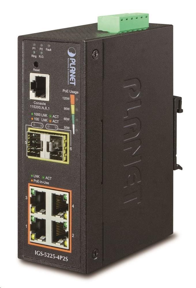 Popis Planet switch IGS-5225-4P2S, průmyslový 4x10/100/1000T, 2x100/1000X SFP, -40~+75°C, PoE