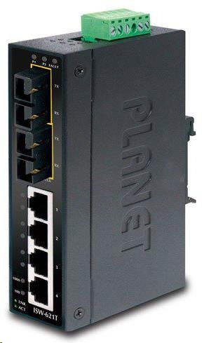 Popis Planet switch ISW-621TS15, průmysl.verze 4x10/100+2x100BaseFX (SC) SM 15km, DIN, IP30, -40 až 75°C, 12-48V