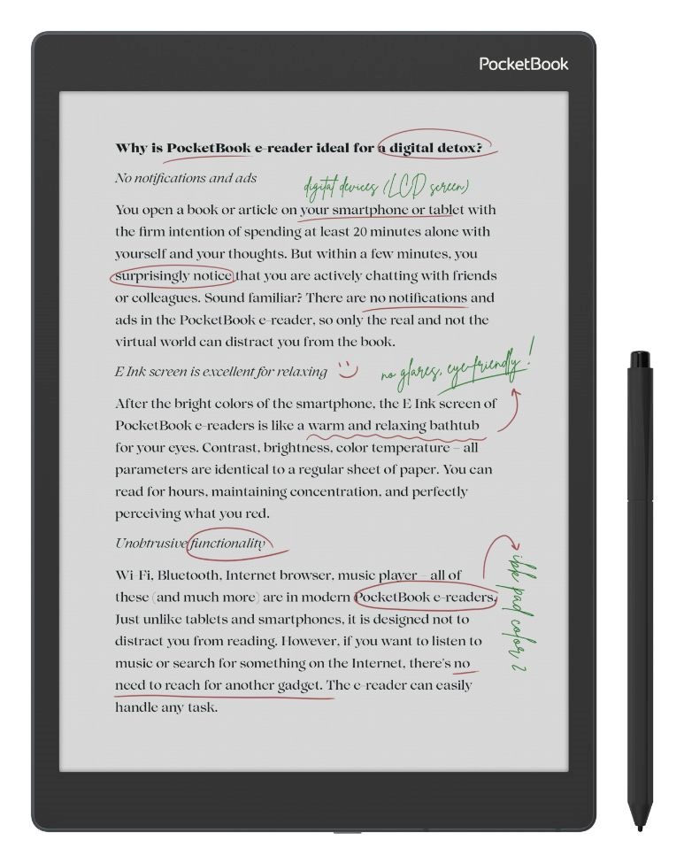 Velký 10,3” barevný displej E Ink Kaleido™ 3, založené na technologii Mobius™, je maximálně šetrný k očím. Neoslňuje a poskytuje dostatek prostoru pro pohodlné psaní a čtení.