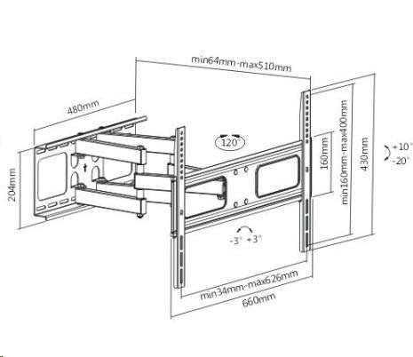 Poctivý nástěnný polohovací držák Tv Fiber Mounts Prominent Držák na Tv 37-70", otočný, sklopný, výsuvný, bytelná konstrukce, nosnost 50kg Nástěnný držák s bytelnou konstrukcí pro spolehlivé a bezpečné zavěšení televizorů s úhlopříčkou 37-70". Televizor lze po zavěšení na tento držák vysouvat od zdi, otáčet do stran, naklápět a v případě nepřesné instalace korigovat rovinu obrazovky. Držák Fiber Mounts Prominent unese televizory s hmotností až 50kg a podporuje VESA standardy 200x200 až 600x400. Barevné provedení černé, záruka 5 let. Technické údaje: nosnost 50kg podpora VESA standardů pro zavěšení Tv 200x200 až 600x400 ideální na televizory s úhlopříčkou 37" až 70" výsuvný, nastavení vzdálenosti Tv od zdi 64mm až 510mm otáčení televizoru do stran +/- 60° možnost velkého náklonu televize dolů až 20°, nahoru až 10° možnost korekce roviny obrazovky kvalitní, robustní konstrukce bezpečné zavěšení televizorů barevné provedení černé záruka 5 let Držák Fiber Mounts Prominent podporuje VESA standardy: VESA 200x200 VESA 300x200 a 200x300 VESA 300x300 VESA 400x200 a 200x400 VESA 400x300 a 300x400 VESA 400x400 VESA 600x400. Fiber Mounts s.r.o., Nádražní 1296/4 69601 Rohatec Česká republika, mailto: info@drzakyastolky.cz