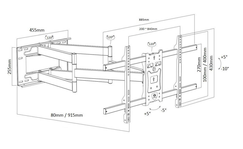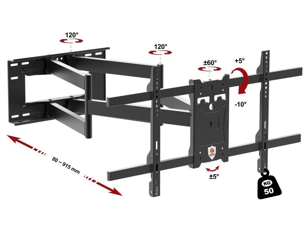 Poctivý držák na televize Ergosolid ONYX-30 Kvalitní nástěnný držák na Tv 43-90", výsuvný 80-915mm, otočný +/-65°, náklon +5°/-10°, korekce roviny +/-5°, VESA 200x100 až 800x400, nosnost 50kg Nástěnný držák poctivé konstrukce pro spolehlivé zavěšení všech typů a značek televizí. Držák Vám umožní televizi nastavit od zdi do vdáleností v rozmezí 80mm až 915mm. Otáčení do stran bude možné minimálně o 60° na každou stranu, náklon je možný v rozmezí +5°až -10°. Pro usnadnění instalace má držák možnost korekce roviny obrazovky až o 5° na každou stranu. Celá konstrukce držáku je vyrobena z poctivé ocely a ani při maximálním vysunutí a maximálním zatížení nevznikají žádné vůle a nedochází k prověšení ramen. Instalační nástěnná plocha s rozměry 455x255mm je dostatečně velká pro spolehlivé uchycení na zeď a výborné rozložení celkové hmotnosti na větší plochu. Držák podporuje VESA standardy 200x100 až 800x400 a zavěsit na něj můžete televize s hmotností až 50kg. Barevné provedení je černé. Na držák poskytujeme záruku 5 let. Nástěnný extra dlouhý výsuvný držák poctivé konstrukce na televize 43-90" Ergosolid ONYX-30 Technické údaje: nosnost 50kg podporuje VESA 200x100 až 800x400 ideální na televize s úhlopříčkou 43" až 90" nastavitelná vzdálenost od zdi 80mm až 915mm otáčení na obě strany až +/- 60° naklápění dolů až o 10° nebo nahoru až o 5° korekce roviny obrazovky až +/- 5° instalační plocha o rozměrech 455x255mm vynikající kvalita ocelová silnostěnná konstrukce instalační materiál je součástí balení barevné provedení černé záruka 5 let Kvalitní konstrukce a opravdu rozsáhlá možnost polohování jsou předností televizního držáku Ergosolid ONYX-30 Tv držák Ergosolid ONYX-30 podporuje tyto VESA standardy: VESA 200x100 VESA 200x200 VESA 300x200 a 200x300 VESA 300x300 VESA 400x200 a 200x400 VESA 400x300 a 300x400 VESA 400x400 VESA 600x400 VESA 800x400 Na televizní držák Ergosolid ONYX-30 můžete zavěsit všechny typy, značky a velikosti televizorů, které mají hmotnost maximálně 50kg a které podporují kterýkoliv z výše uvedených VESA standardů. Univerzální držák na LCD LED plazma OLED QLED televize 43-90" Ergosolid ONYX-30 V balení naleznete tento instalační materiál: šrouby M4x14mm 4ks šrouby M6x14mm 4ks šrouby M6x30mm 4ks šrouby M8x20mm 4ks šrouby M8x45mm 4ks malé distační válečky 4ks velké distanční válečky 4ks univerzální podložky 4ks podložky na šrouby 5ks vruty do hmoždinek 8x60mm 5ks hmoždinky O10x50mm 5ks stahovací pásky na suchý zip 2ks (fixace kabeláže na držáku) Televizní držák poctivé konstrukce a vynikající kvality Ergosolid ONYX-30 dodáváme včetně instalačního materiálu Držáky Tv Ergosolid ONYX-30 poskytují velkou variabilitu polohování obrazovky, vynikající zpracování a naprosto bezpečné zavěšení televizoru za dostupnou cenu. Tyto držáky vydrží opravdu mnoho let bez nutnosti jakýchkoliv oprav a díky univerzálnosti jsou vhodné i v případě zakoupení nové televize. Stanou se součástí Vašeho domova.. Fiber Mounts s.r.o., Nádražní 1296/4 69601 Rohatec Česká republika, mailto: info@drzakyastolky.cz