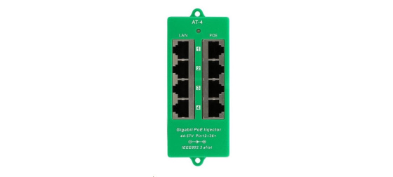 Panel integrující čtyři gigabitové POE injektory s napájecím rozsahem 44-57V a max. proudem 550mA/port s podporou standardu 802.3af/at.