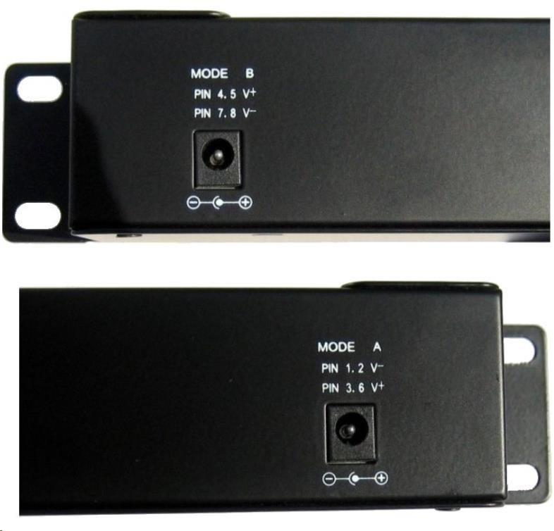 Režim B (Mode B): Kompatibilní s prvky využívající napájení na pinech 4/5+ a 7/8- jako např. prvky využívající pasivní PoE 24V (Mode B) od Mikrotiku a Ubiqiti.