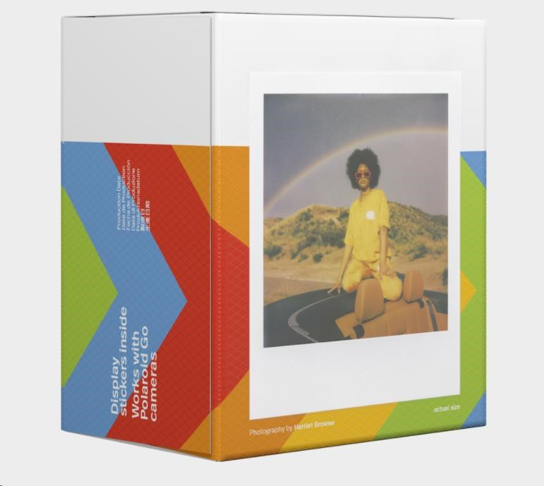 Každé balení obsahuje 16 barevných instantních fotografií s lesklým bílým rámečkem připravených pro světlo světa. Exkluzivně pro použití s fotoaparáty Polaroid Go. Velikost: 66,6 × 53,9 mm / velikost snímku: 47 × 46 mm Bílý rámeček ASA 640 Vyvíjení fotografie do 10–15 minut Nejlépe uchovávat v chladničce. Polaroid Corporation, 1265 Main Street, Waltham, Massachusetts 02451, USA, support@polaroid.com