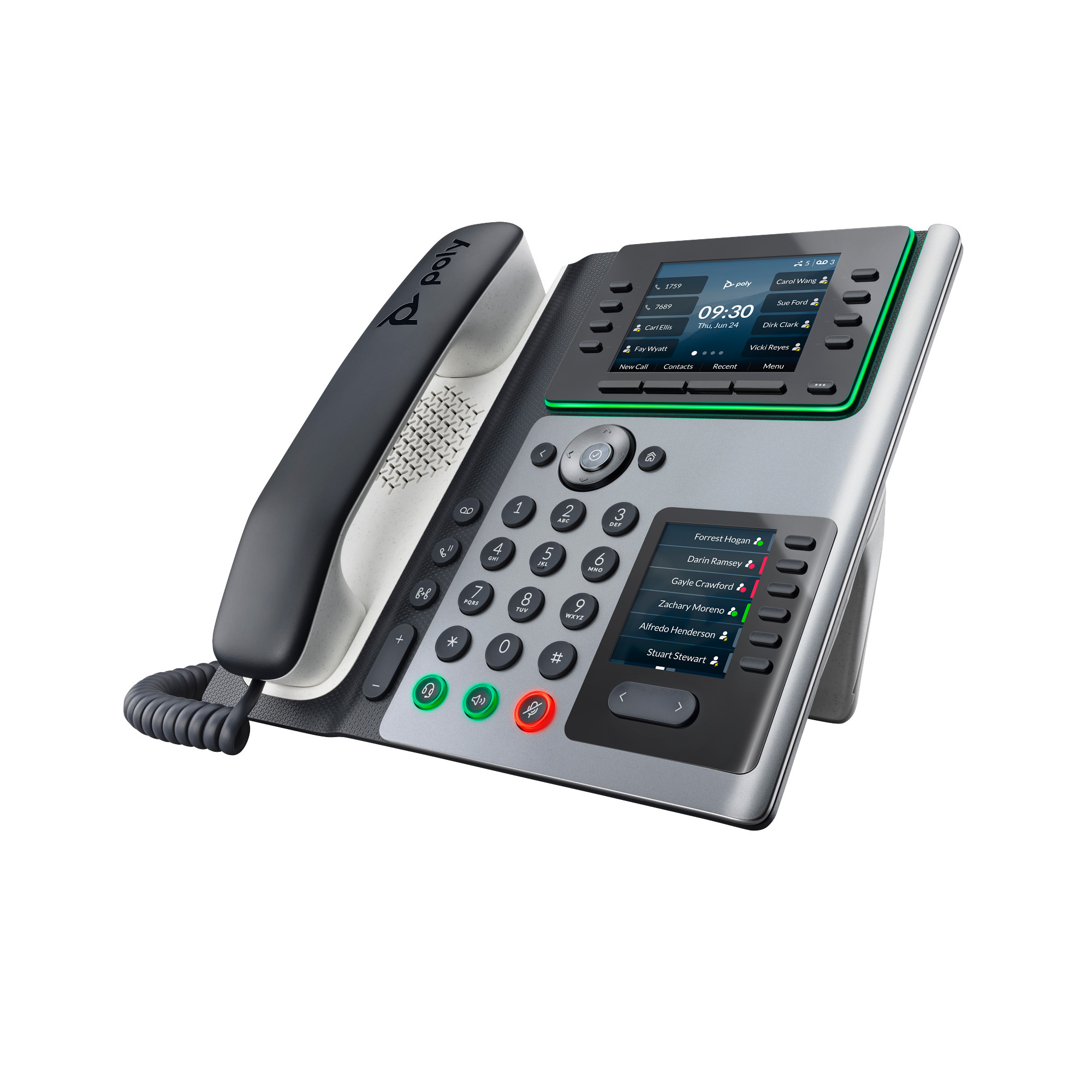 | Audio | Poly HD Voice; Technologie Poly Acoustic Clarity zajišťuje plně duplexní hovory a potlačuje akustickou ozvěnu i okolní šum; Technologie Poly Acoustic Fence potlačuje okolní hluk při použití sluchátka nebo kabelové náhlavní soupravy; Technologie Poly NoiseBlockAI odstraňuje většinu okolního hluku při používání konferenčního reproduktoru; Aplikace Poly Computer Audio Connector nainstalovaná v počítači (pouze Windows) umožňuje vybrat telefon pro zvukový vstup a výstup počítače a použít s počítačovými aplikacemi sluchátka, volitelné náhlavní soupravy a handsfree hlasitého odposlechu; Design s vylepšenými basy; Širokopásmový zvuk TIA-920, v souladu s typem 1 (plně duplexní IEEE 1329); Individuální nastavení hlasitosti s vizuální zpětnou vazbou pro každou zvukovou cestu; Detekce hlasové aktivity; Komfortní tvorba hluku; Generování tónů DTMF (RFC 2833 a v pásmu); Přenos zvukových paketů s nízkým zpožděním; Adaptivní paměti pro vyrovnání zpoždění |