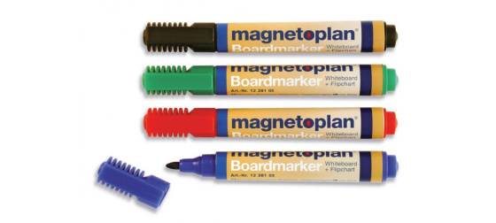 Popisovač na bílé magnetické tabule nebo flipchart papír. Za sucha stíratelný. Šířka stopy 1,5 – 3 mm. Sada á 1 ks: černá, červená, modrá, zelená..