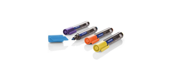 NOVÉ BARVY: Popisovač na bílé magnetické tabule nebo flipchart papír. Za sucha stíratelný. Šířka stopy 1,5 - 3 mm. Sada á 1 ks: světle modrá, fialová, žlutá, oranžová.. Holtz Office Support GmbH, Berta-Cramer-Ring 14-16, Wesbaden 65205, DE, info@holtz-gmbh.de