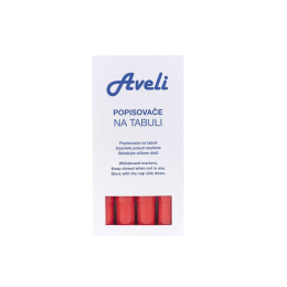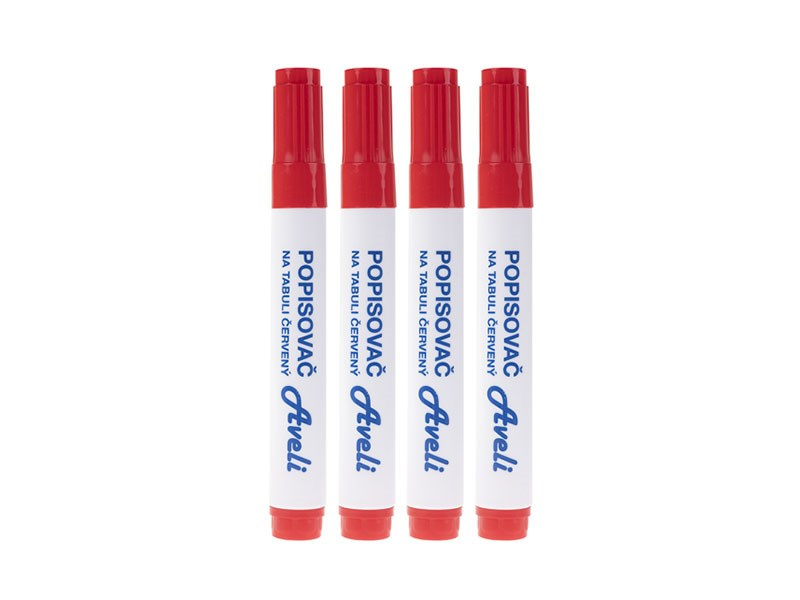 Popisovače na tabule a flipcharty AVELI. Sada 4 červených popisovačů. Netoxický Šíře stopy 4 mm Kuželový hrot Snadno stíratelný Odolný proti vyschnutí.