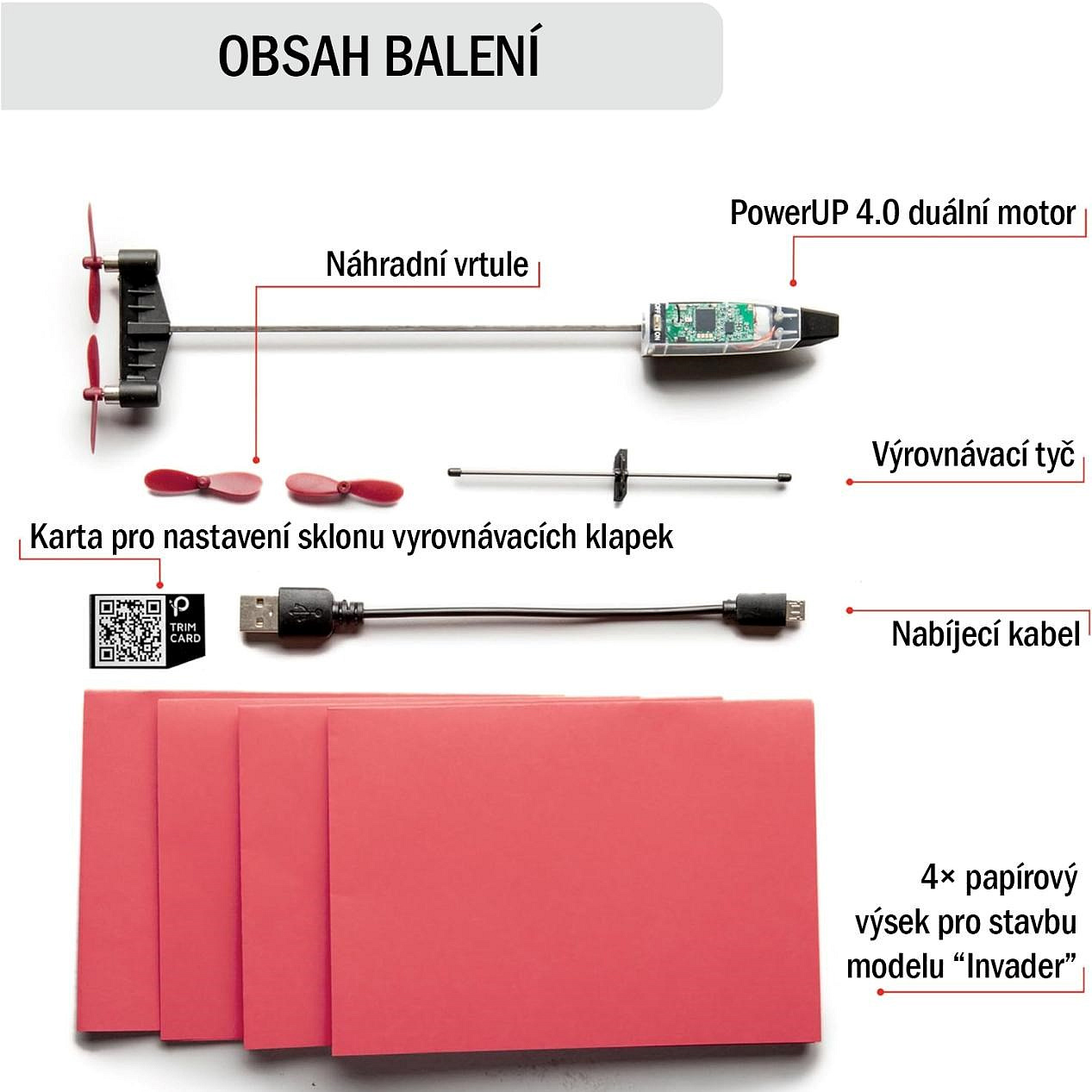 Základní balení obsahuje chytrý duální motor PowerUp 4.0, nabíjecí kabel, náhradní vrtule, křížovou vzpěru, kartičku pro vyladění sklonu klapek a sadu archů. Celý set tak funguje jako fantastický dárek, u kterého malí i velcí piloti najdou vše potřebné k okamžitému startu.
