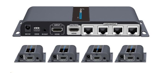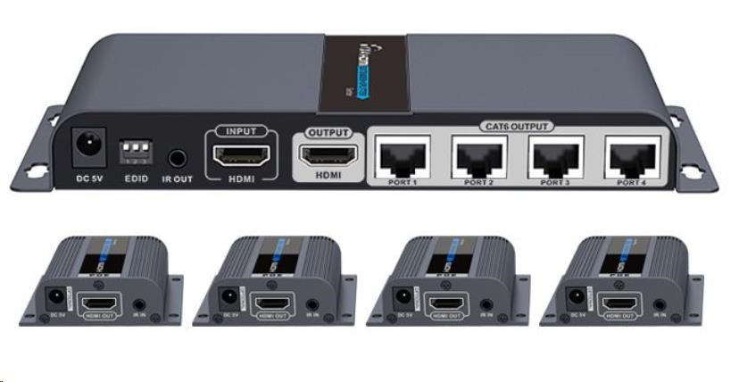 - Výstupy: 1x lokální výstup HDMI a vysílači, 4 x HDMI výstupy (Type A) na přijímačích