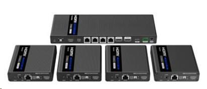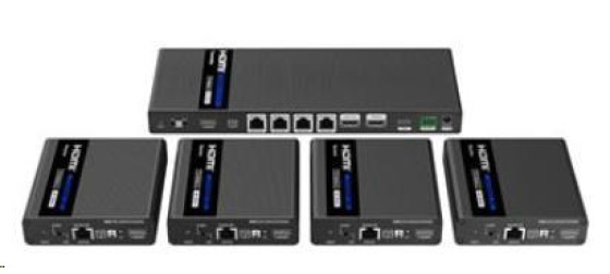 Extender se skládá z jedné vysílací jednotky s lokálním výstupem HDMI a čtyř přijímačů, které se propojí CAT6/6a/7 kabelem s vysílačem.