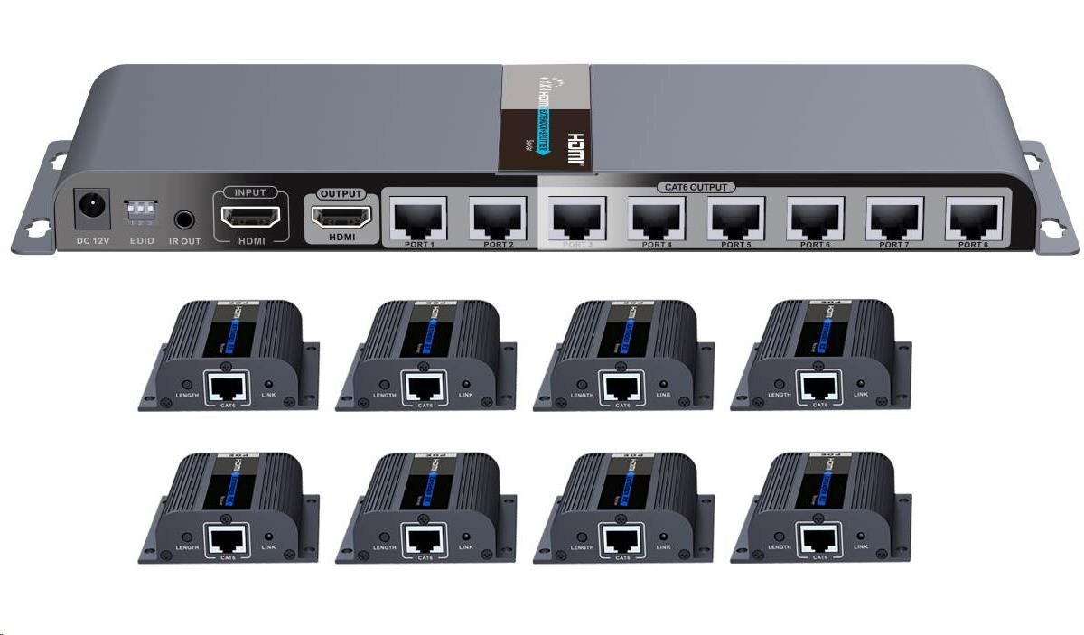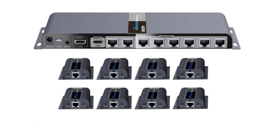 Extender se skládá z jedné vysílací jednotky s lokálním výstupem HDMI a osmi přijímači, které se propojí CAT6/6a/7 kabelem s vysílačem.