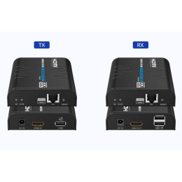 - Extender přenáší také USB, vysílač má jeden USB pro zapojení do počítače, přijímač má dva USB konektory pro zapojení například myši, klávesnice nebo dotykové obrazovky