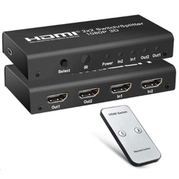 Zařízení umožní ze dvou vstupů HDMI jeden vybrat a zobrazit signál na dvou výstupech zároveň (monitorech/TV..) HDMI. Funguje jako zesilovač signálu, splitter a přepínač.