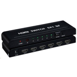 5 HDMI zařízení sdílí 1 HDMI výstupní zařízení (obrazovku). Výběr zařízení tlačítkem nebo dálkovým ovládáním.