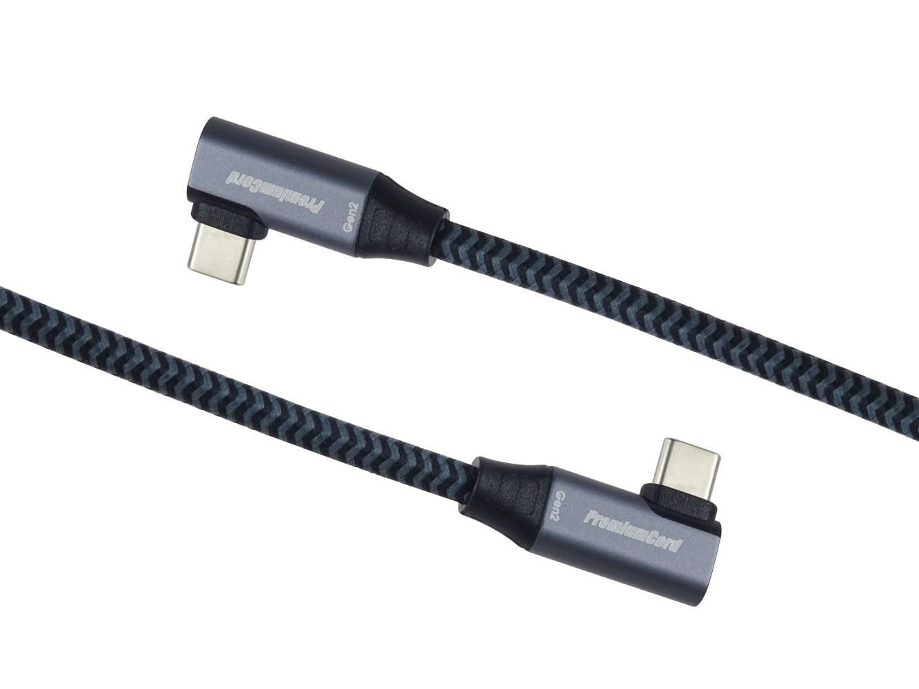 PremiumCord USB-C 2x zahnutý 90° kabel ( USB 3.2 GEN 2x2, 5A, 100W, 20Gbit/s ) hliníkové krytky konektorů, bavlněný oplet, 2m